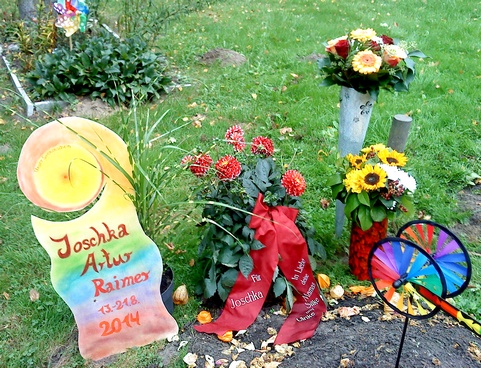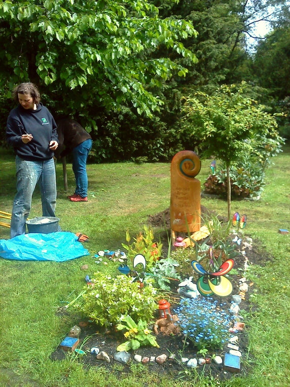 Das Grabmal wurde von der Bildhauerin Anja Backhaus geschnitzt, deren lebensfrohe,